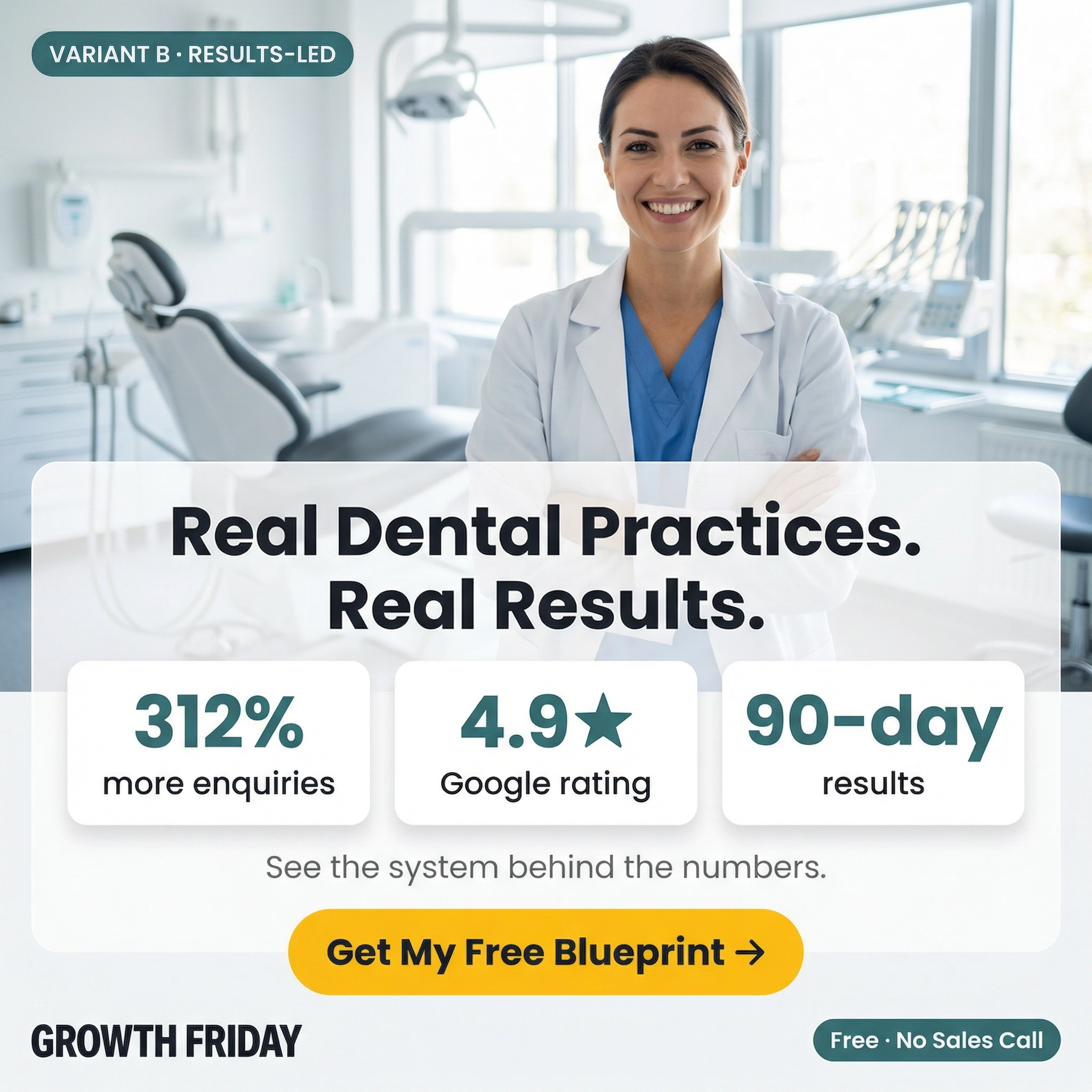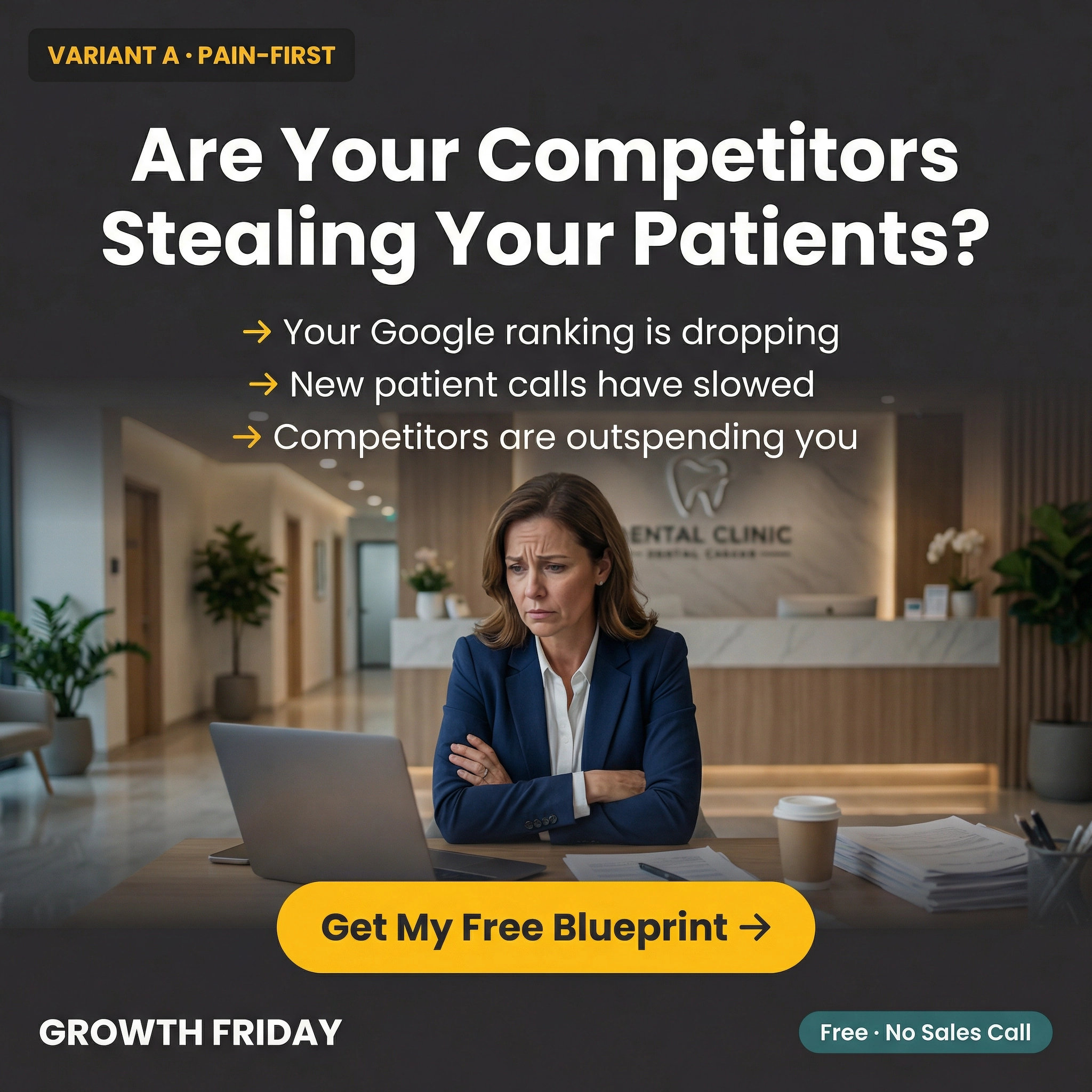 Three 1080×1080 single-image ads for the Dental Blueprint retargeting campaign. Each matches its landing page angle and targets non-converting website visitors.